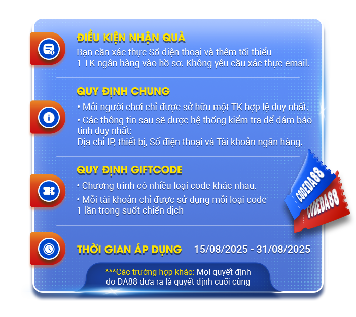 DA88 - Nhà cái đẳng cấp Châu Âu. DA88 đem đến cho khách hàng dịch vụ cá cược trực tuyến hàng đầu với hàng trăm sản phẩm cược hấp dẫn như: Thể Thao, Thể Thao Ảo, Casino, Number Games, Keno ...